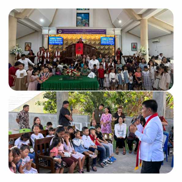 Dengan senyum hangat dan bahasa yang sederhana, ia menyapa para siswa Sekolah Minggu yang menyambutnya penuh antusias.